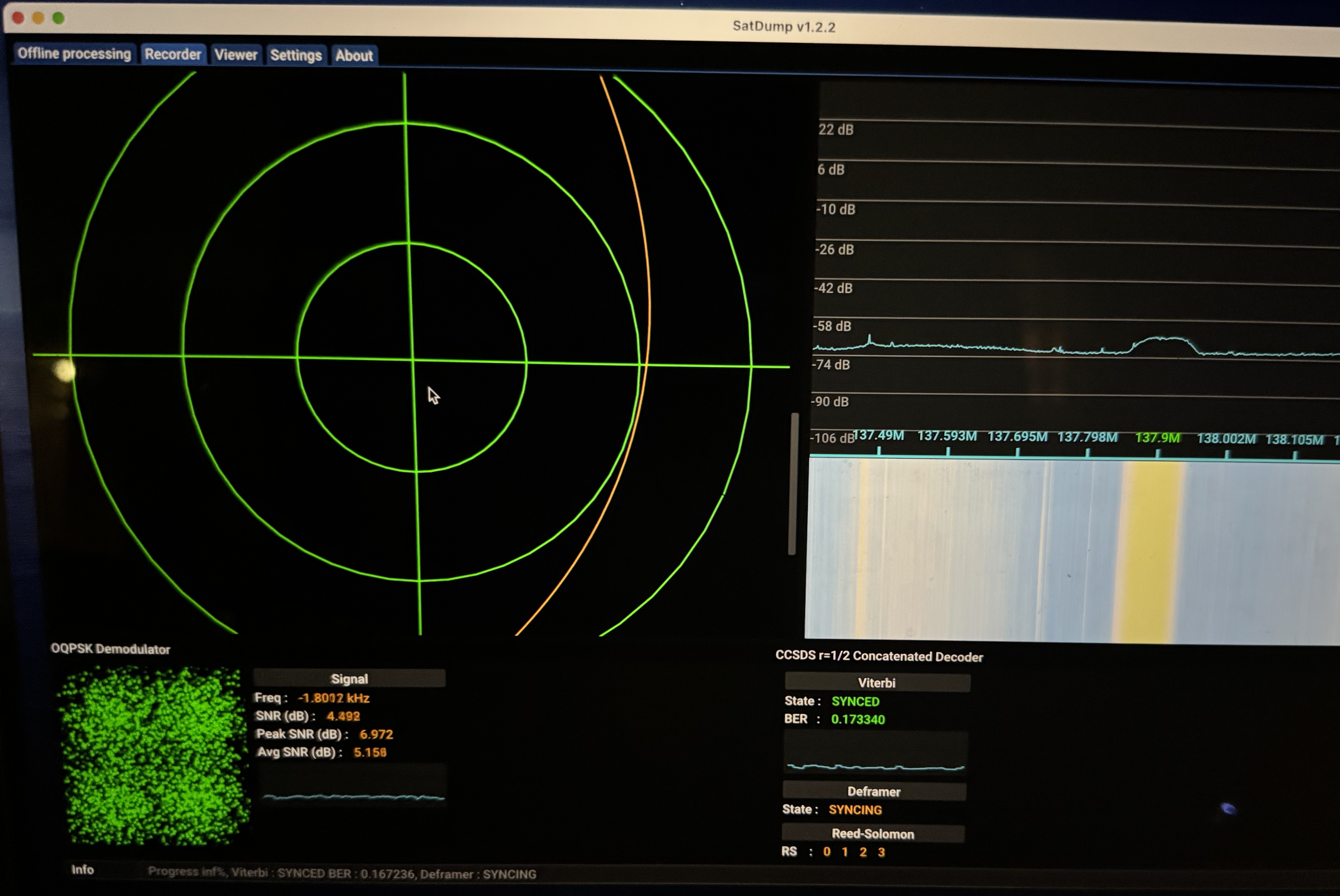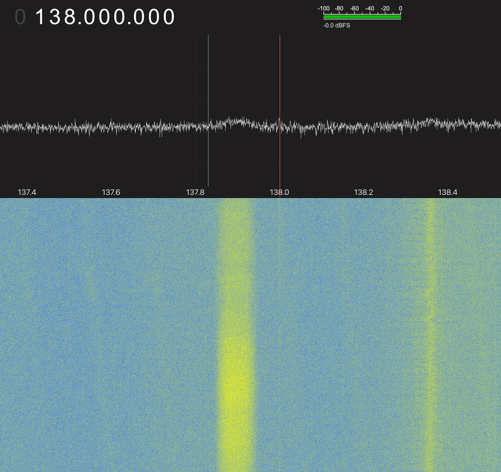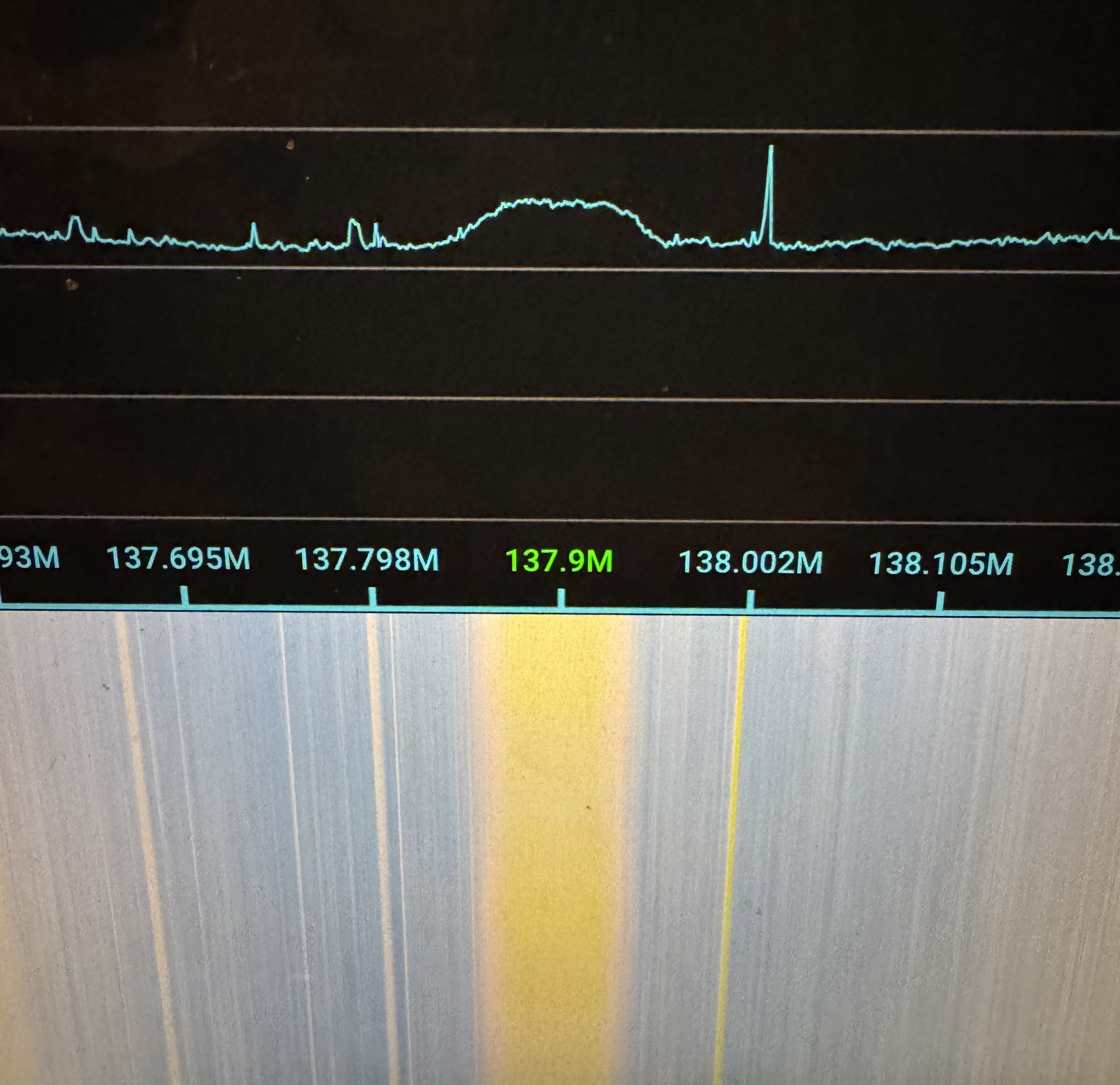 RTL-SDR V4 feeding into GQRX on MacOS, got to see my first evidence of a signal on 137.9 MHz. Interestingly you can see the signal faiding from bottom to top in this screen shot: